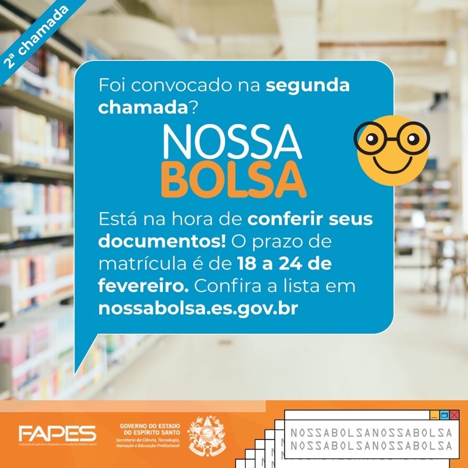 O resultado da segunda chamada do Programa Nossa Bolsa 2021 foi divulgado, na última sexta-feira (12), pela Fundação de Amparo à Pesquisa e Inovação do Espírito Santo (Fapes), e está disponível no site da Fundação e no site do programa (wwww.nossabolsa.es.gov.br).