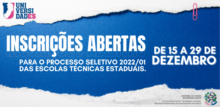Foram abertas nesta quarta-feira (15) e seguem até 29 de dezembro, as inscrições para admissão de alunos nas escolas técnicas do Governo do Estado do Espírito Santo, referentes ao Edital Sectides Nº 021/2021, para cursos de educação profissional técnica de nível médio. A seleção é para ingresso no primeiro semestre de 2022.
