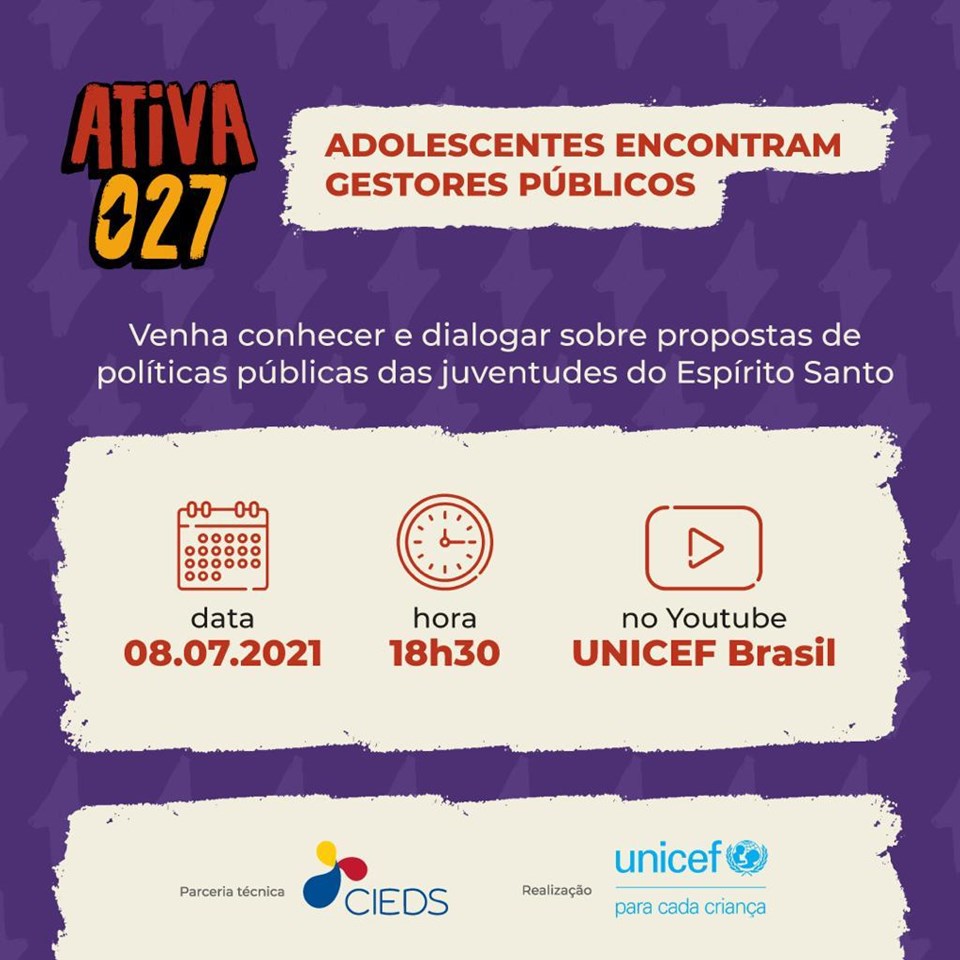 Jovens e adolescentes do projeto Ativa 027 farão um bate-papo on-line sobre políticas públicas voltadas para a juventude com a secretária de Estado de Direitos Humanos, Nara Borgo, nesta quinta-feira (08), a partir das 18h30, no canal do Fundo das Nações Unidas para a Infância (Unicef) Brasil no YouTube: youtube.com/UNICEFBrasil.