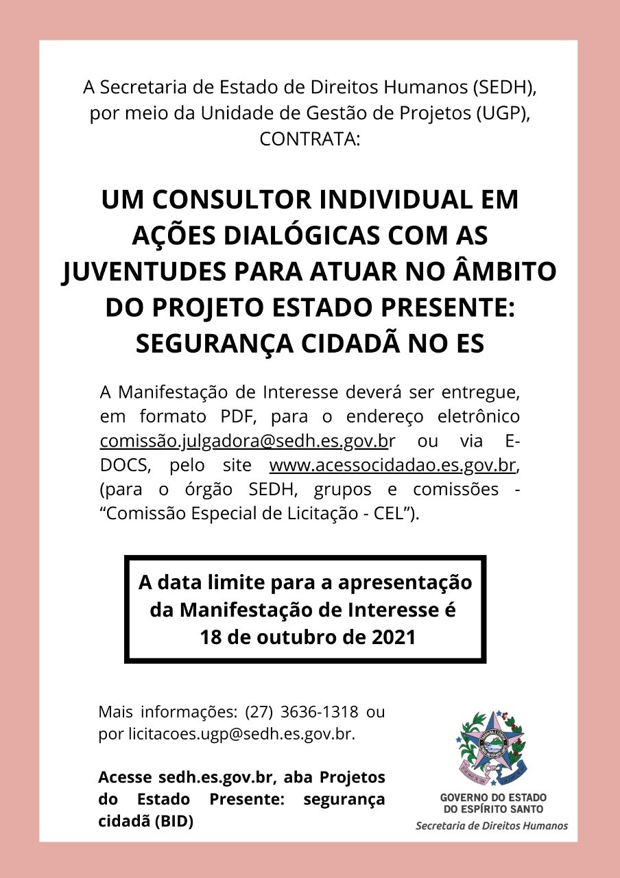 A Secretaria de Direitos Humanos (SEDH) publicou novo edital para a contratação temporária de consultor individual, especialista em Ações Dialógicas com as Juventudes, para o Projeto Estado Presente: Segurança Cidadã. As inscrições podem ser feitas até o dia 18 deste mês.