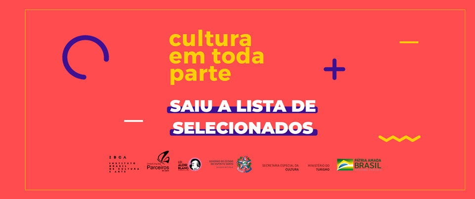 Com a realização do Instituto Parceiros do Bem, o Cultura em Toda Parte – Região 1 conta com recursos da Lei Aldir Blanc, via Chamamento Público, para a Seleção de Organização da Sociedade Civil (OSC) realizar a Gestão e Operacionalização do Projeto Cultura em Toda Parte – Circulação e Difusão de Atividades Artísticas e Culturais no Estado do Espírito Santo, por intermédio da Secretaria da Cultura (Secult), direcionada pela Secretaria Especial da Cultura do Ministério do Turismo, Governo Federal.