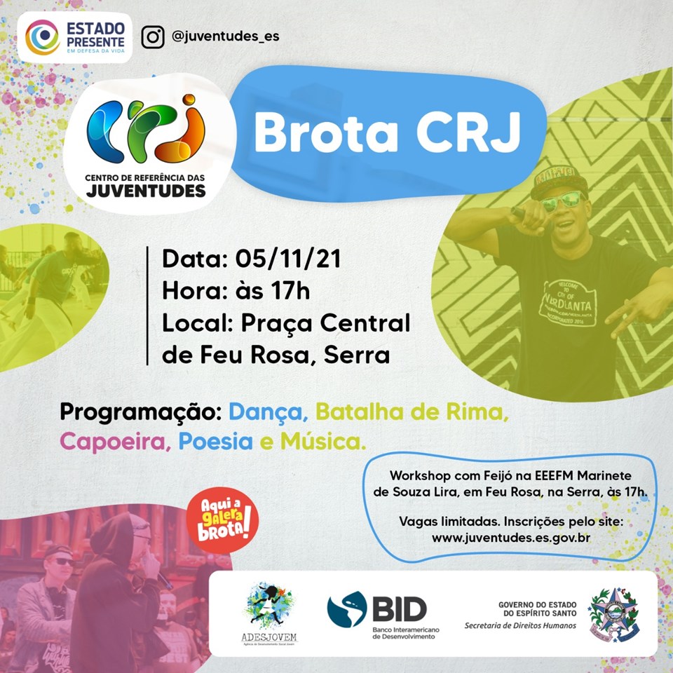 As juventudes da região de Feu Rosa vão se divertir de graça no “Brota CRJ”, o primeiro evento de preparação para a implantação do Centro de Referência das Juventudes (CRJ) da cidade, na próxima sexta-feira (05), na Praça Central de Feu Rosa, na Serra. O encontro terá muita música, dança, batalha de rima, capoeira e poesia.