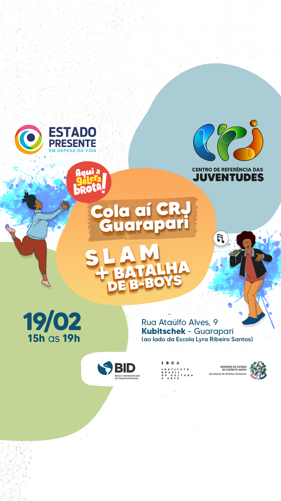 No próximo dia 19, acontece o Cola Aí CRJ Guarapari. O encontro vai contar com apresentações da cultura hip hop e coletivos culturais, para apresentar o projeto do Centro de Referências da Juventude (CRJ) Guarapari, que será implantado no bairro Kubitschek. O evento é gratuito e vai acontecer das 15h às 19h, na Rua Ataulfo Alves, nº 9, ao lado da Escola Estadual de Ensino Fundamental e Médio (EEEFM) Lyra Ribeiro Santos.