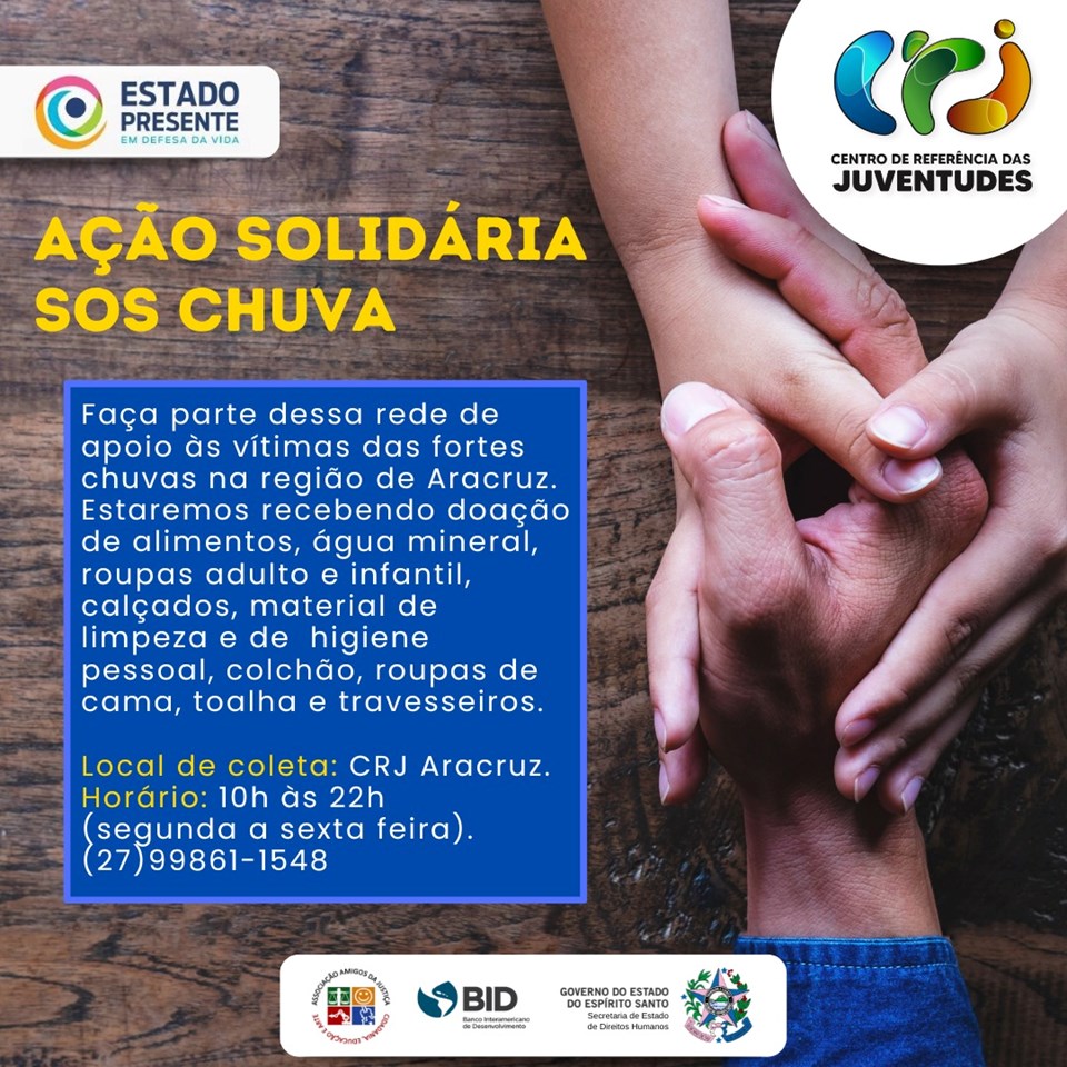 Por causa das chuvas que atingiram o Espírito Santo e deixaram várias famílias em situação de vulnerabilidade, o Centro de Referência das Juventudes (CRJ) Aracruz está aceitando doações para ajudar as vítimas das chuvas na cidade.