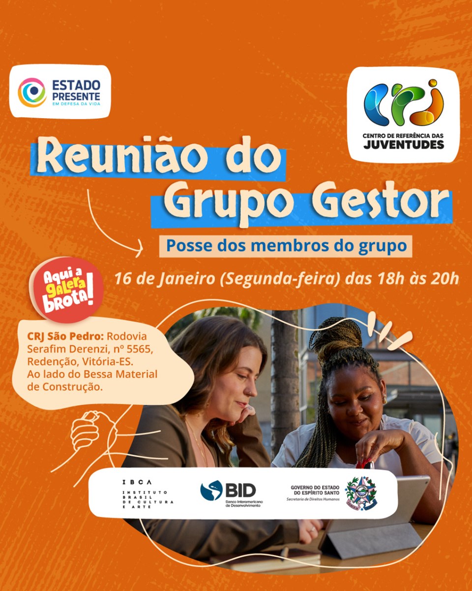 O Centro de Referência das Juventudes (CRJ) São Pedro, localizado em Redenção, Vitória, realiza, nesta segunda-feira (16), a Reunião do Grupo Gestor, com posse dos membros do grupo, a partir das 18h.