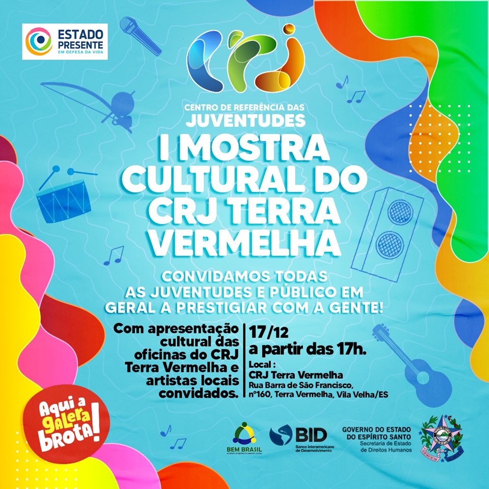 O Centro de Referência das Juventudes (CRJ) Terra Vermelha realiza, nesta sexta-feira (17), a I Mostra Cultural do CRJ Terra Vermelha, a partir das 17h. As atrações são as apresentações dos jovens que frequentam as oficinas do CRJ e artistas locais.