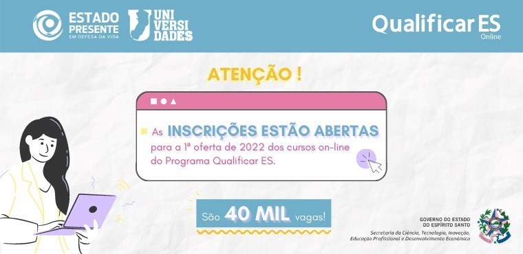 O Governo do Estado abre, nesta terça-feira (15), as inscrições para cursos on-line do Qualificar ES. São 40 mil vagas em 16 opções de cursos, com carga horária de 120 horas cada. O programa é gerenciado pela Secretaria de Inovação e Desenvolvimento (Sectides) e os interessados têm até o dia 25 de fevereiro para providenciar a inscrição no site www.qualificar.es.gov.br.