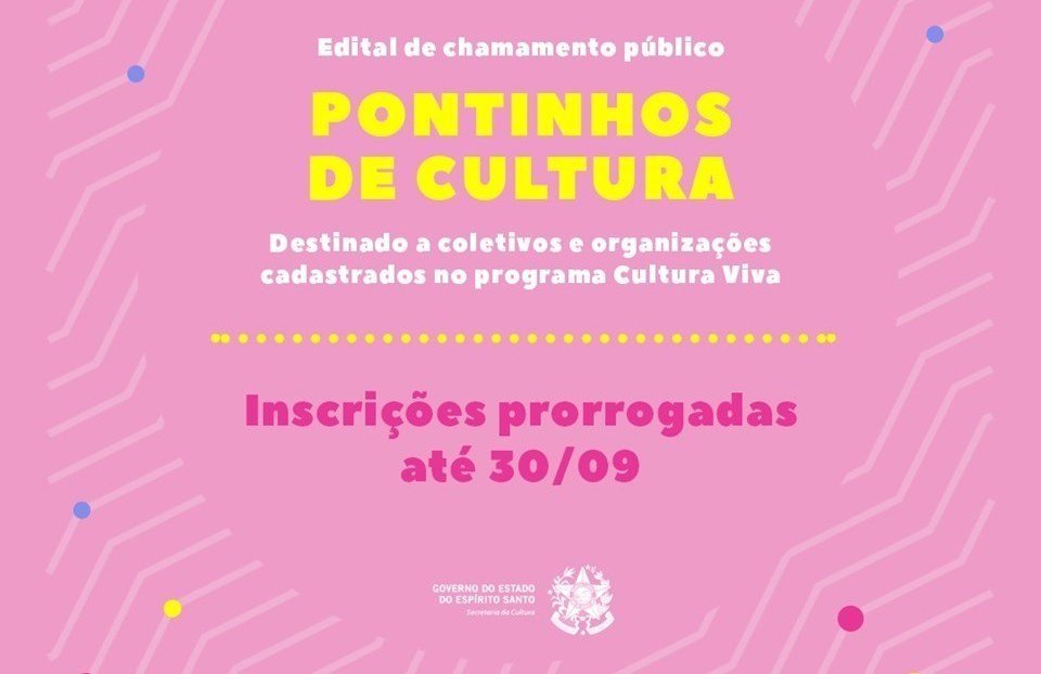 A Secretaria da Cultura (Secult) prorrogou as inscrições do edital de chamamento público 001/2021 – “Pontinhos de Cultura” para o dia 30 de setembro. O edital vai premiar seis iniciativas culturais desenvolvidas por instituições privadas, sem fins lucrativos, com constituição jurídica e coletivos culturais sem constituição jurídica, cadastradas no Programa Cultura Viva, do Governo Federal. O Edital disponibiliza uma verba total de 60 mil.