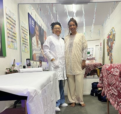 Thayane Costa, à direita, em aula do curso de Massoterapia
