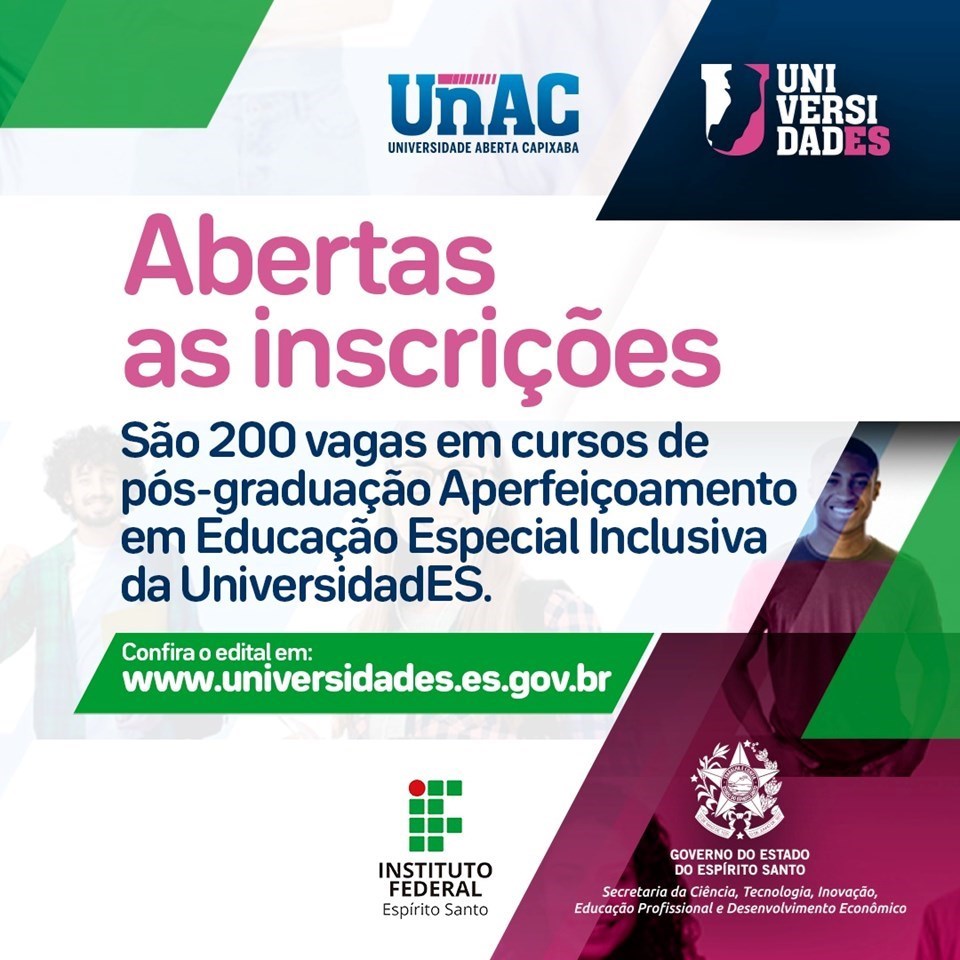 Estão abertas oportunidades de pós-graduação, por meio do Sistema Universidade do Espírito Santo – UniversidadES. São 200 vagas no curso de Pós-graduação (Aperfeiçoamento) em Educação Especial Inclusiva, ofertadas pelo Instituto Federal de Educação, Ciência e Tecnologia do Espírito Santo (Ifes), e que integram as ações da Universidade Aberta Capixaba (UnAC).