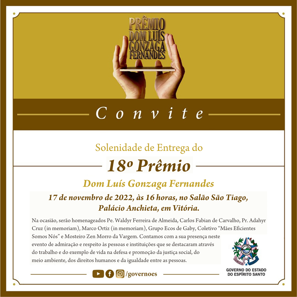 No próximo dia 17, o Governo do Estado, por meio da Secretaria de Direitos Humanos (SEDH), realiza a 18ª edição do prêmio Dom Luís Gonzaga Fernandes. Este ano, a solenidade acontecerá de forma presencial, às 16 horas, no Salão São Tiago, no Palácio Anchieta, em Vitória.