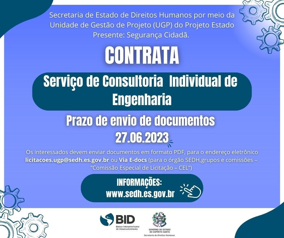 A Secretaria de Direitos Humanos (SEDH), por meio da Unidade de Gestão de Projeto (UGP) do projeto Estado Presente: Segurança Cidadã, está contratando engenheiro. Os interessados devem entregar a documentação até o próximo dia 27 de junho.